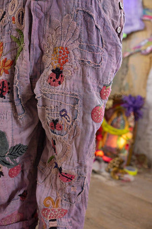 Памучни ленени деним гащеризони с бродирана любов с тежки поправки, кръпки, смесени копчета, ръчно избледняване, износване и поправки