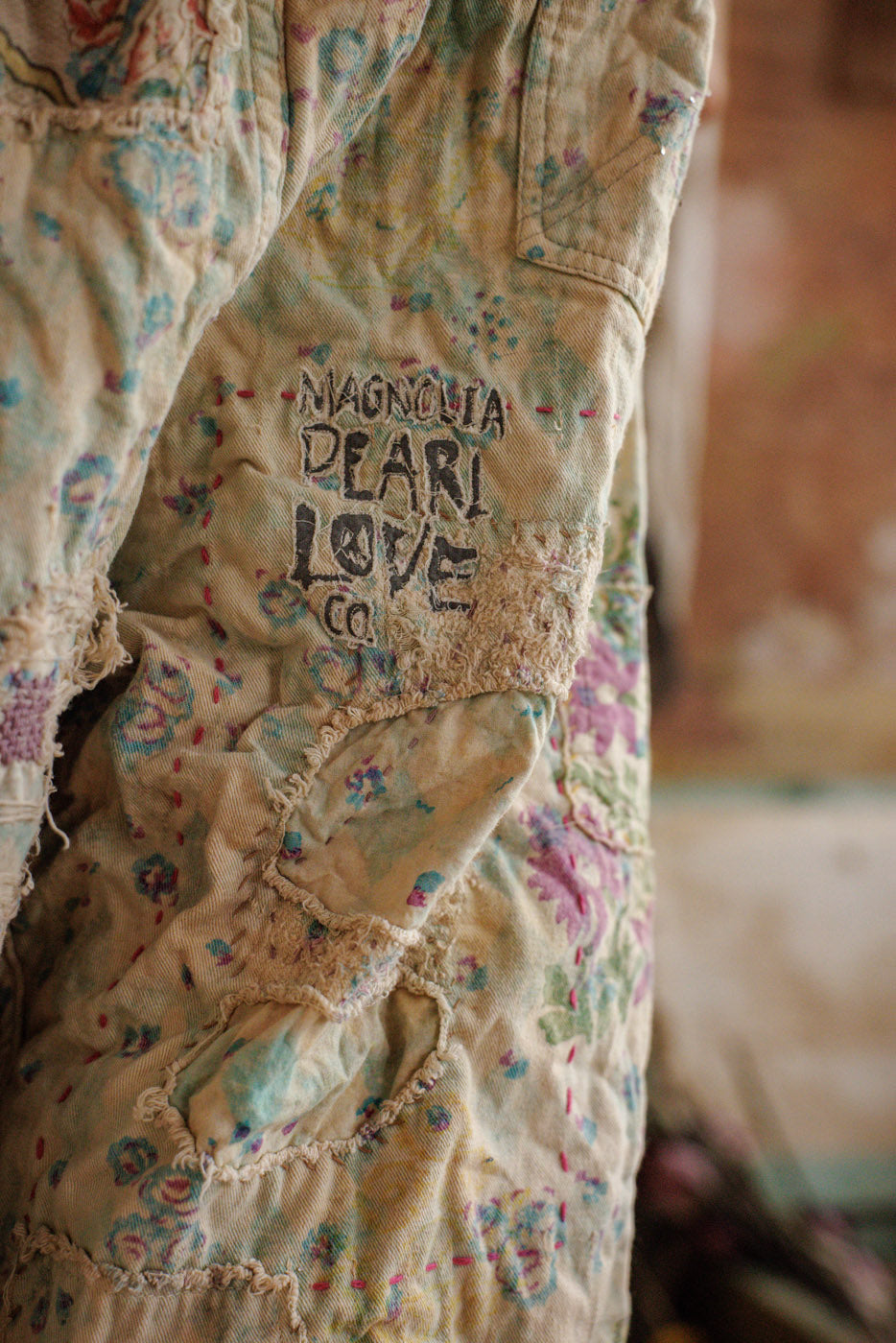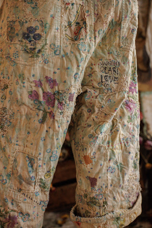 Памучни панталони Twill Clover Dani Blues с флорални графики, кръпки, смесени копчета на талията, пристягане отзад, ръчно поправяне, избледняване и износване
