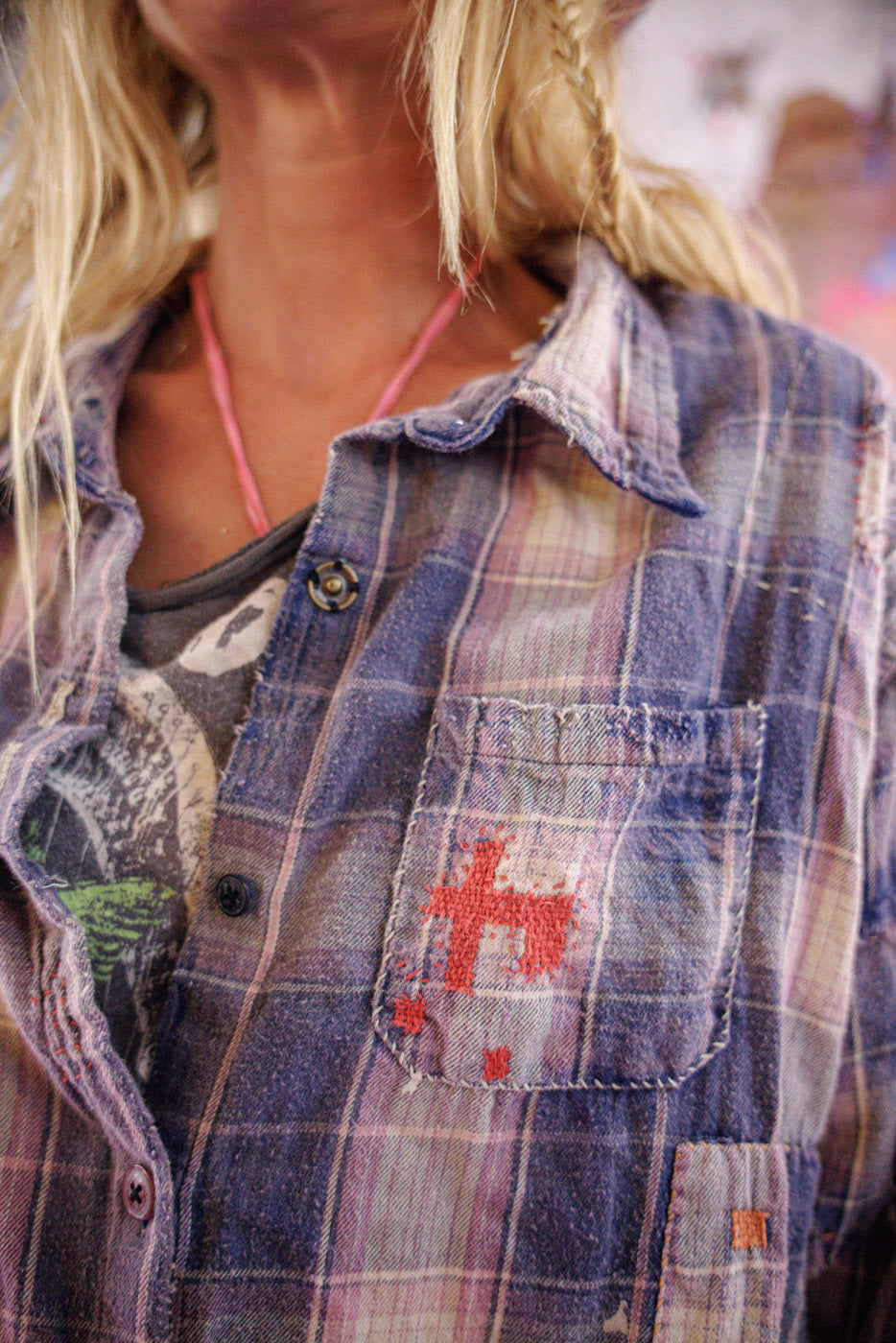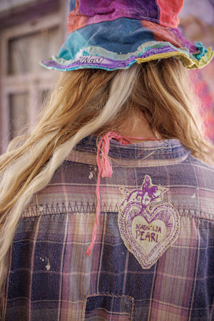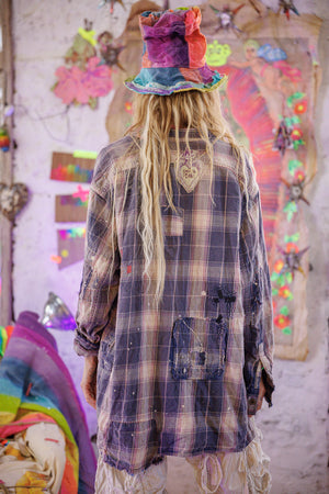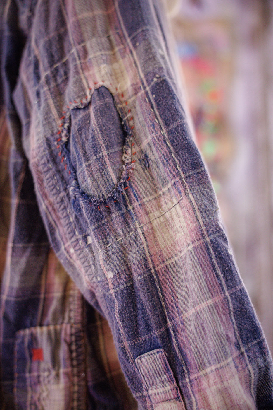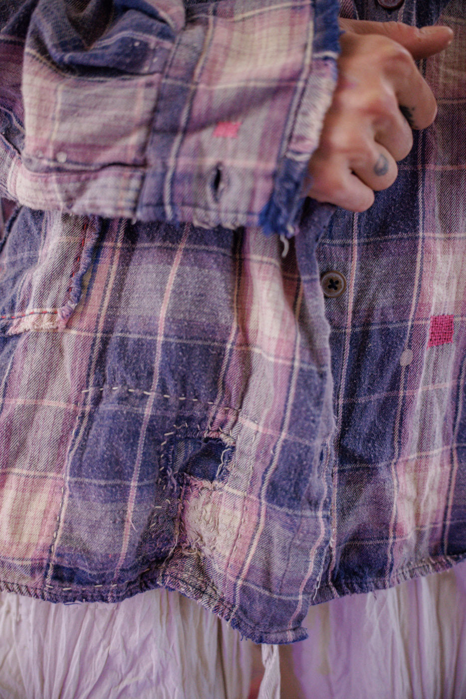 Garnfarvet bomulds Knox-skjorte med lapper, rå kanter, malerstænk, trykknapper og knapper, håndblegning, reparation og slid