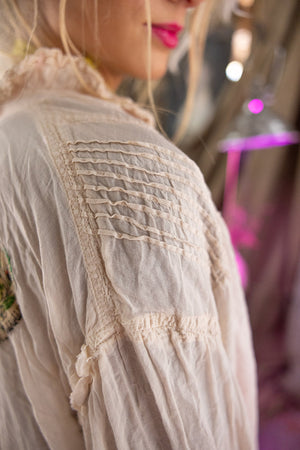 Blusa Amadeus de Algodón Europeo con Bordado, Lazos de Seda, Detalles de Volantes, Pliegues, Encaje Desgastado, Broches, Reparación a Mano, Desvanecimiento y Desgaste