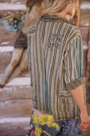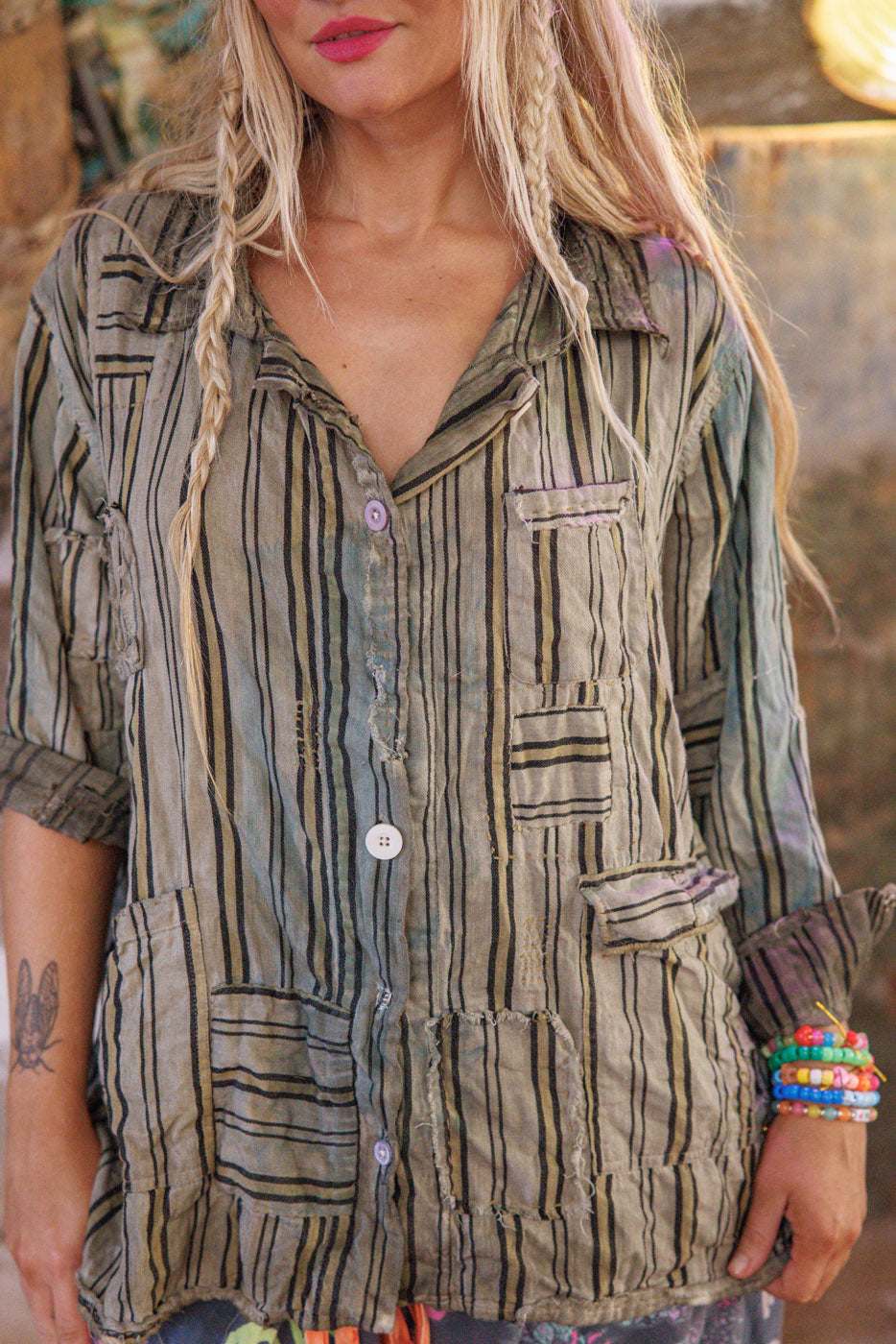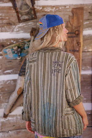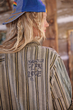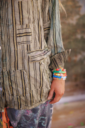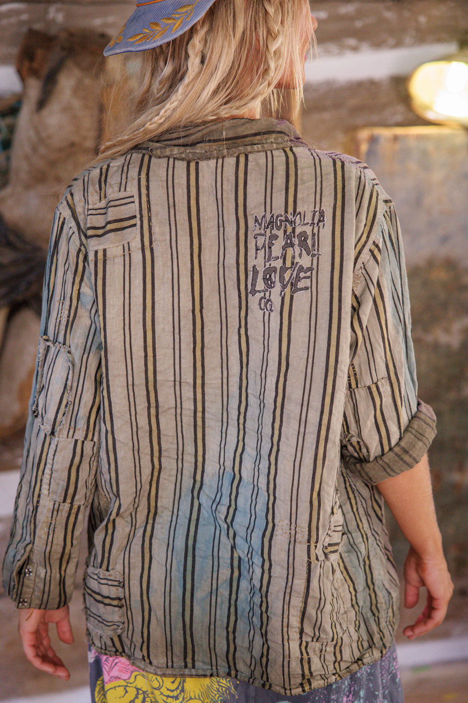 Chaqueta de Fresa de Algodón Teñido en Hilo con Costuras Expuestas, Bordes Deshilachados, Parches, Botones Mixtos y Broches