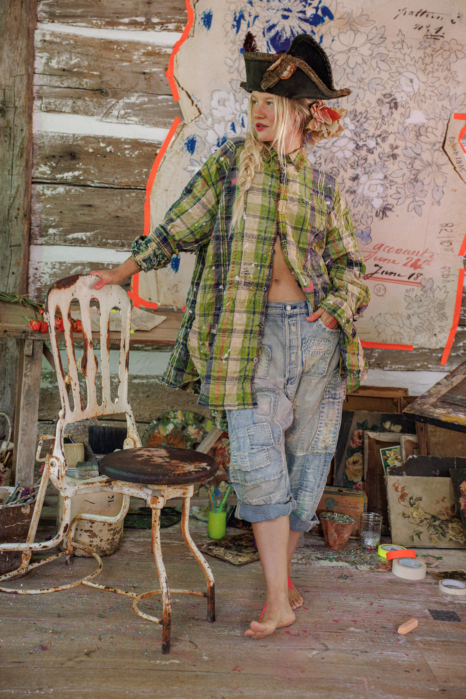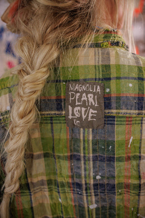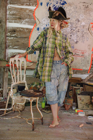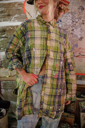 Camisa de trabajo Truvy de algodón teñido en hilo con parches, salpicaduras de pintura, botones mixtos, remiendo a mano, desvanecimiento y desgaste