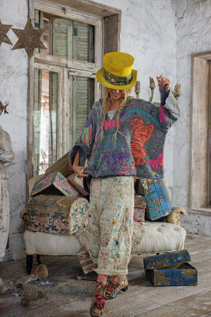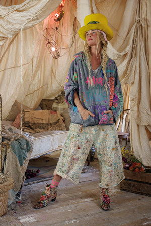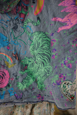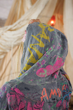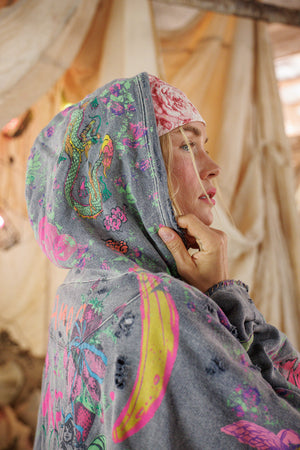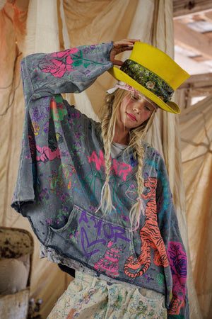 コットンフリース ラジフーディー グラフィック入り、ラフなエッジ、手作業によるフェード加工とダメージ