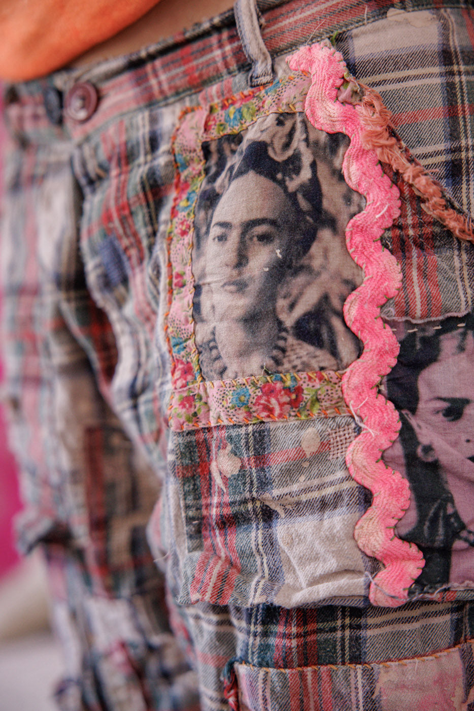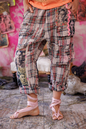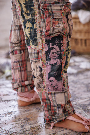 Garnfarget bomull Frida fotobokser Tatum cargobukser med lapper, malingssprut, Ric Rac, blomsterkant, broderi, knapp i livet, snøring bak, håndreparasjon, falming og slitasje