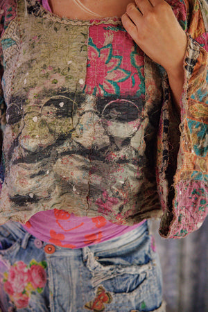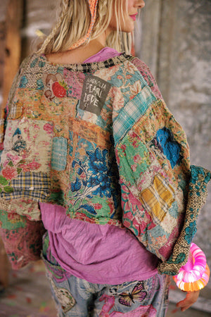 Europeisk bomull quiltet patchwork Bapu poncho topp med malingssprut, applikasjon, Ric Rac, håndreparasjon, falming og slitasje