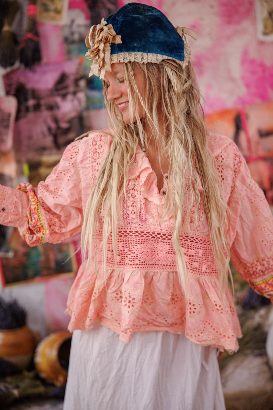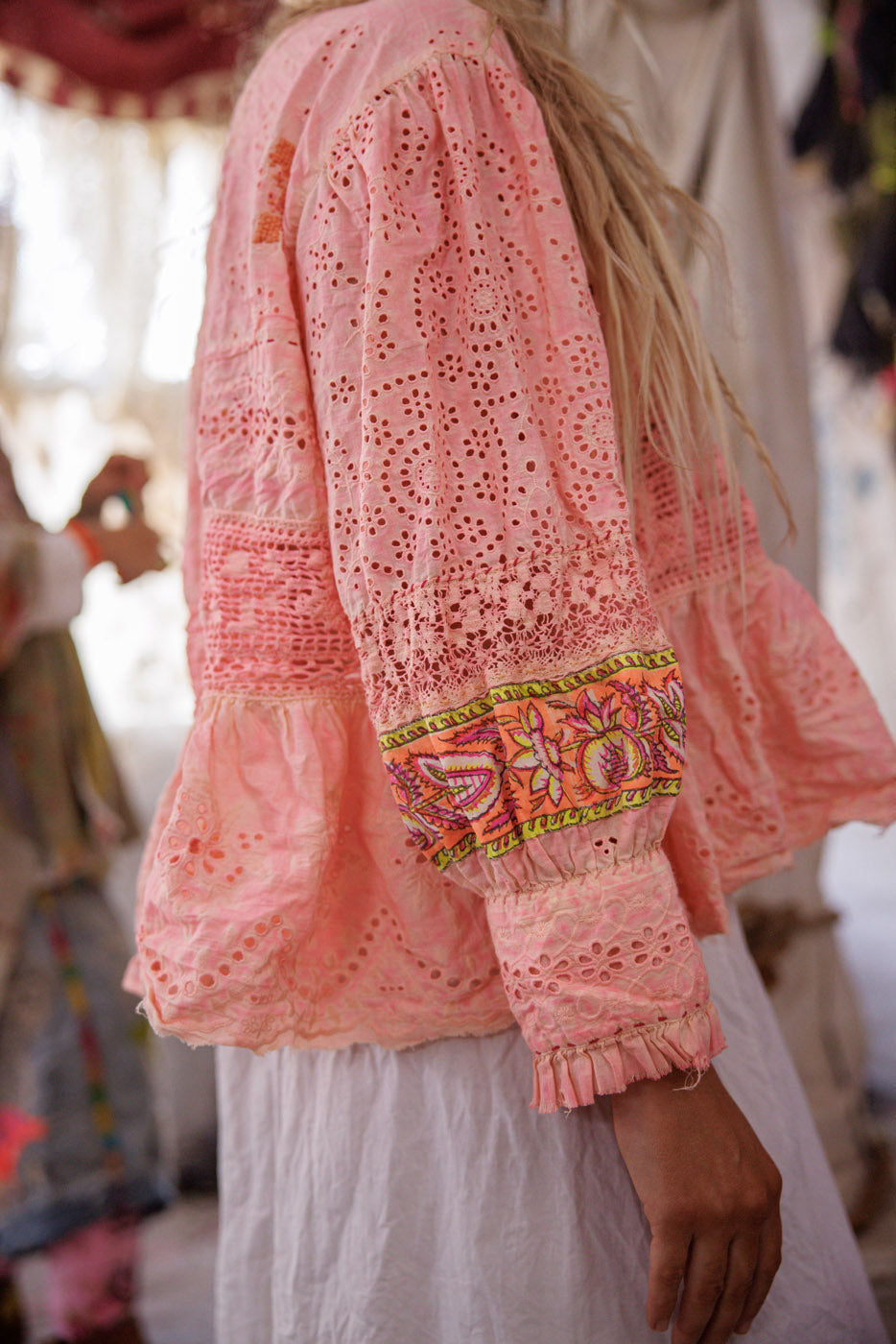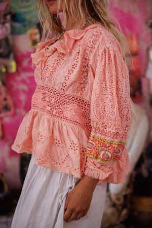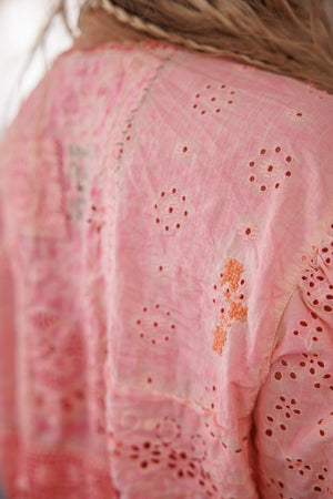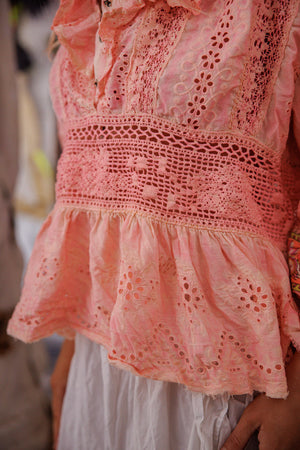 Europeisk bomullsrose Pompadour-bluse med heklet liv, hullbroderi rysjkrage med trykknapper, blonder, kantet fald, trykknapper på ermene, håndbleket og slitt