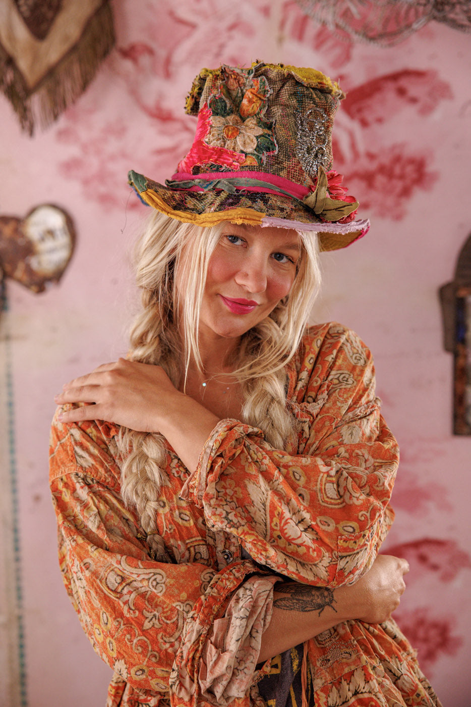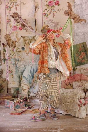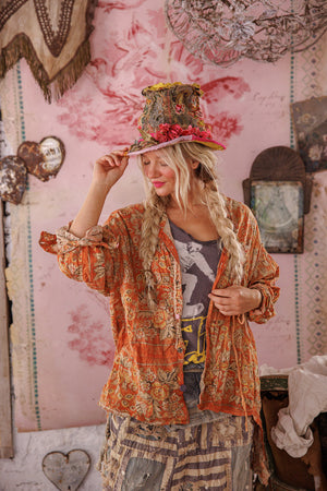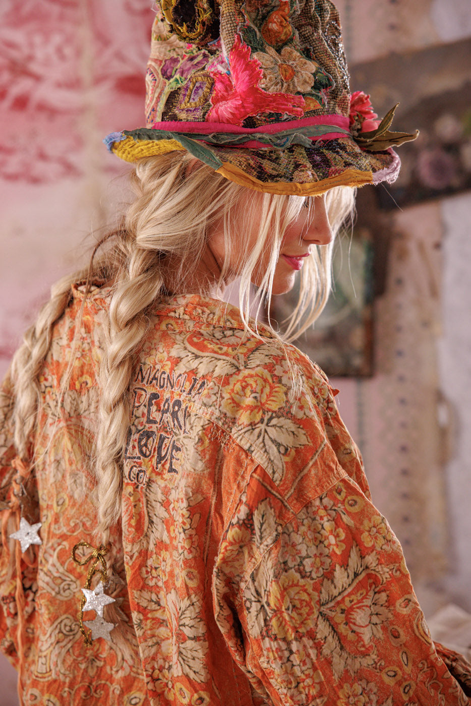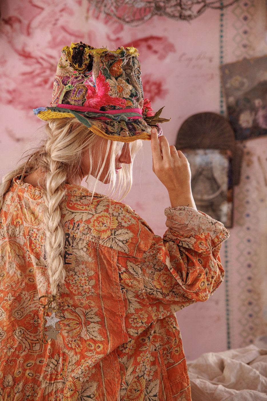 Bomullspoplin solfalmet Adison arbeidskjorte med lapper, blandede knapper og trykknapper, håndfarget og reparert
