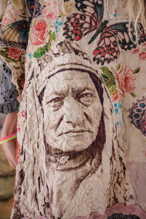 Glem aldri de hvis arv er sammenvevd med landet og hvis ånder gjenlyder gjennom naturen. The Great Spirits Bretta Poncho er en talisman for minne, advokatvirksomhet og altomfattende ærbødighet. Urfolksledere Sitting Bull (Hunkpapa Lakota) og Geronimo (Bedonkohe Ndendahe Apache) taler til motstand, respekt og den radikale, revolusjonære kraften av kjærlighet, nysgjerrighet og skjønnhet.